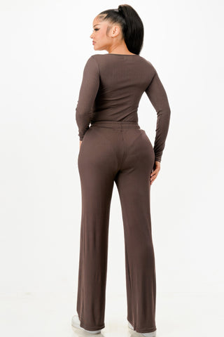 Two-piece set with long sleeve ribbed bodysuit and wide-leg pants