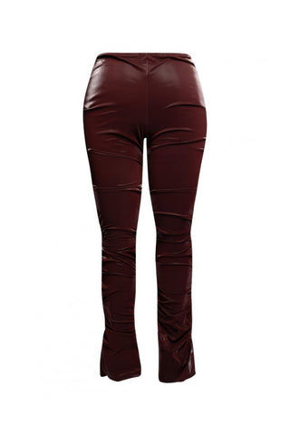 Product Description: Turn heads in these velvet PU ruched pants, crafted to bring sleek drama and curve-enhancing style to your wardrobe. The high-waisted cut defines your silhouette, while the pull-on design ensures easy, comfortable wear. Made from a luxe velvet PU blend, these pants feature ruching throughout for added texture and a flattering, body-contouring effect. With a hint of stretch, they move with you while maintaining their structured look. Perfect for evenings out or adding a bold statement to everyday outfits.