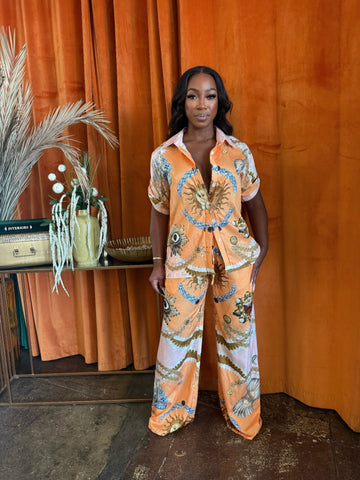 Product Description: The Solar Muse Pants Set channels effortless resort elegance with a vibrant twist. Crafted from silky, lightweight fabric, this two-piece ensemble features a short-sleeve button-down top paired with wide-leg pants for a breezy, coordinated look. The radiant sun and seashell motifs add celestial charm, while the bold orange base makes a confident style statement. With its luxurious drape and relaxed silhouette, this set transitions seamlessly from sunny days to moonlit evenings. Wear it together or mix and match for versatile, vacation-ready styling.