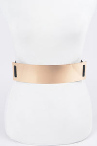 Product Description: Designed for bold waist definition, this version of the Metal Plate Elastic Belt features a wider silhouette for dramatic impact. Its structured metal plate front contrasts with a flexible, stretchable band, providing comfort without sacrificing style.