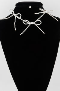 Product Description: Feminine and polished, the Triple Pearl Ribbon Necklace features three lustrous faux pearls strung on a delicate ribbon. Its short length makes it ideal for layering or highlighting your neckline. Soft, romantic, and effortlessly elegant, this piece is perfect for weddings, date nights, or everyday charm. Designed for comfort and impact, it's a standout choice for classic accessorizing. Timeless sophistication meets playful charm in this graceful necklace.