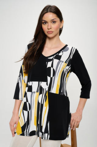Product Description: Make a bold impression with the Hit Contrast V-neck Tunic Top, where graphic design meets everyday ease. This quarter-sleeve top features a striking geometric print in a dynamic mix of black, yellow, and white. The flattering V-neckline elongates the silhouette, while the ITY stretch fabric ensures all-day comfort and polished structure. Its longer length makes it a versatile piece to pair with trousers, leggings, or denim. Made in the USA, it’s a vibrant and reliable addition to your wardrobe.