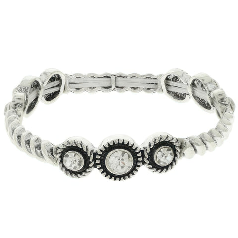 Product Description: Add a touch of rustic charm to your accessories with the Western Crystal Bezel Ribbed Stretch Bracelet. Designed in oxidized silver-tone metal, this bracelet features bezel-set crystals with a rippled, ribbed texture that offers a vintage-inspired yet modern aesthetic. The stretch fit ensures comfortable wear for any wrist size, making it perfect for everyday style or special occasions. Whether you're headed to a country music festival or a casual outdoor dinner, this piece blends boho chic with western flair. Its minimalist design makes it versatile enough to wear alone or stacked for a bolder statement. Embrace timeless elegance with a southwestern twist.
