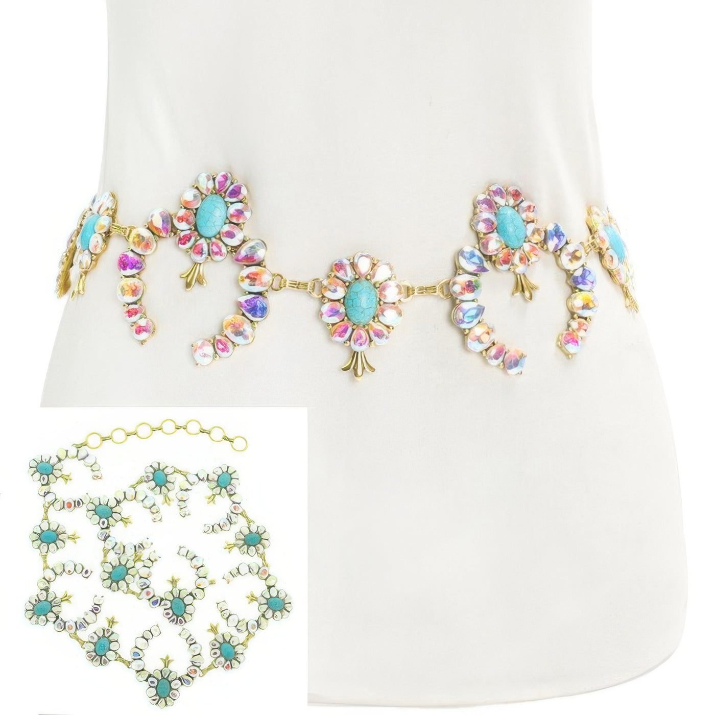 Product Description: Channel bold western charm with this squash blossom chain link belt, embellished with sparkling crystals. Crafted in silver-tone metal, it blends traditional flair with statement shine. The adjustable chain design lets you style it over dresses, denim, or outerwear for a striking silhouette. Ideal for concerts, festivals, or rodeo events, this belt brings instant Southwestern glam to your wardrobe.