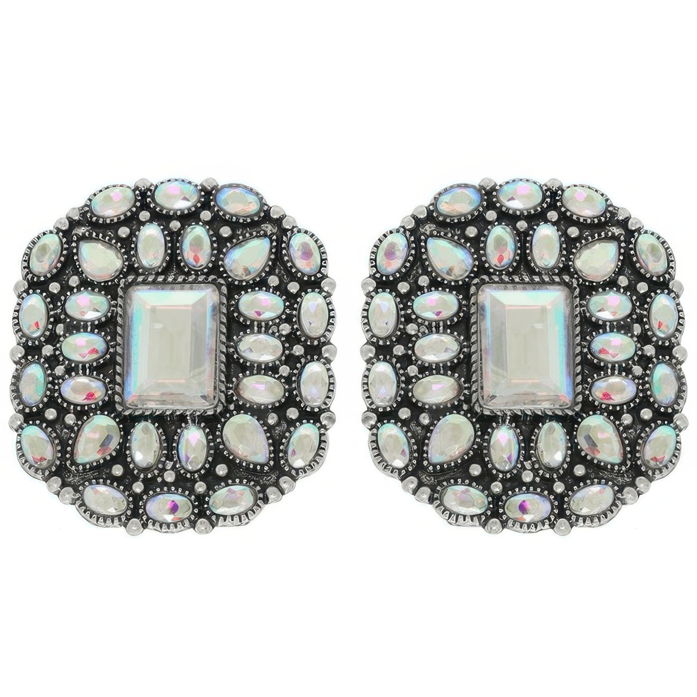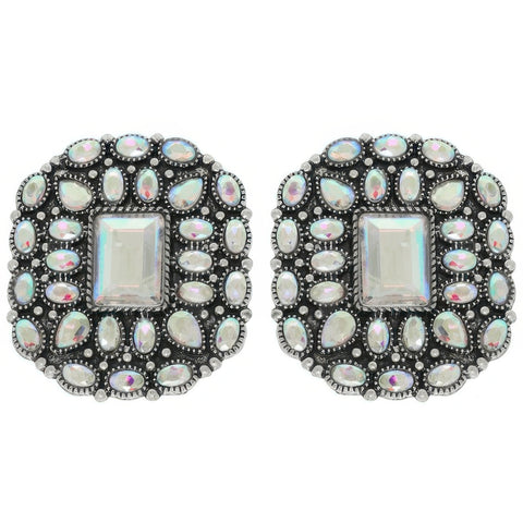 Product Description: Add a bold Western flair to your look with these crystal-embellished concho post earrings. Designed in oxidized silver-tone metal, they offer a rustic yet glamorous finish that's perfect for everything from country weddings to night-out looks. The vintage-inspired silhouette evokes saloon charm while sparkling crystals deliver eye-catching appeal. These earrings strike the perfect balance between rugged and refined, making them a standout accessory for any modern cowgirl. Whether you're headed to a rodeo or dressing up denim, this pair adds the perfect dose of Western sparkle.