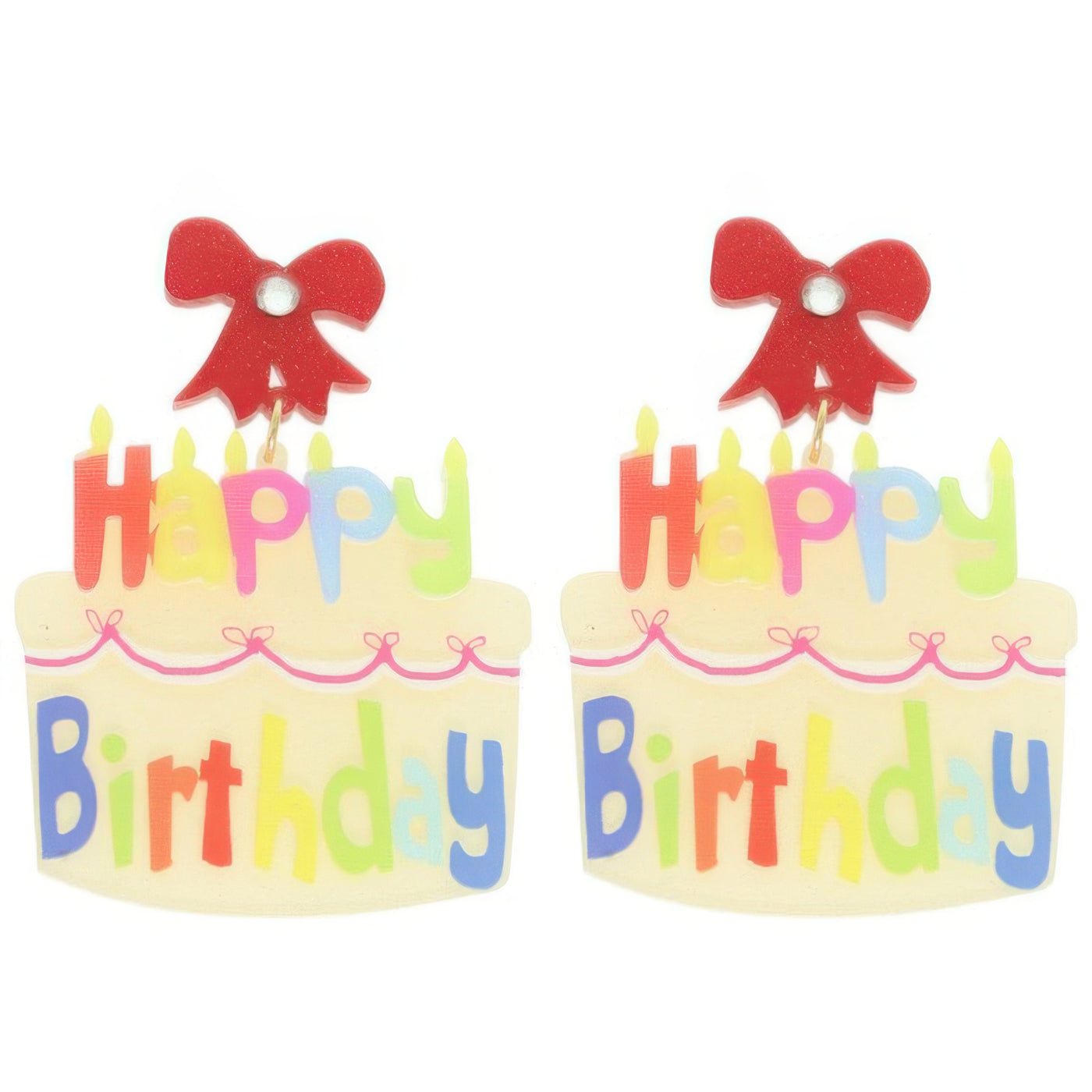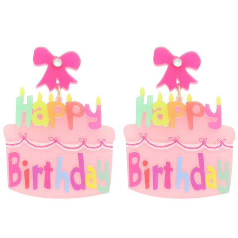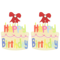 Product Description: Make every celebration brighter with these "Happy Birthday" glittered acrylic cake earrings. Featuring a playful two-tier cake design and colorful dangle style, they add instant joy and sparkle to your party look. Lightweight and eye-catching, they’re perfect for birthday girls, guests, or anyone who loves a fun, festive accessory. The shimmering acrylic finish gives them a bold yet polished flair for brunches, parties, or nights out. Celebrate in style with earrings that are as cheerful as the occasion.