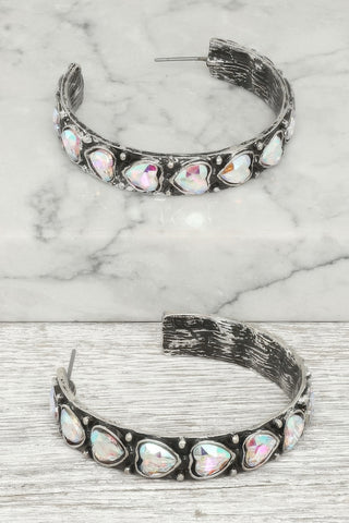 Product Description: Sparkle with Western flair in the Western Heart Cut Crystal Hoop Earrings. These oxidized silver-tone hoops feature heart-shaped cut crystals that catch the light with every turn. Designed with cowgirl glam in mind, they bring a mix of rustic charm and refined sparkle to any outfit. Their medium size makes them perfect for daily glam or a standout look at special events. Whether you're headed to a rodeo, dinner date, or country wedding, these earrings are your go-to for bold, feminine shine.
