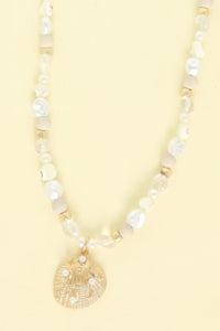 Product Description: Channel seaside charm with this scallop shell pendant pearl bead necklace. Set in yellow gold-tone metal, the necklace features a detailed shell pendant paired with lustrous pearl beads. Its ocean-inspired design makes it the perfect accessory for vacations, summer events, or beachside gatherings. Polished yet playful, this necklace adds a touch of coastal elegance to any look.