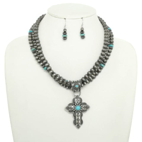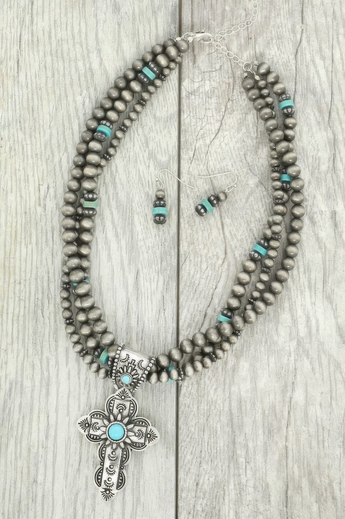 Western Turquoise Cross Pendant Necklace Set - Turquoise.Sbtq