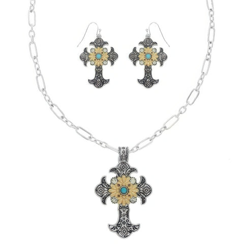 Product Description: Bring meaning and style together with the Western Turquoise Cross Necklace Set. This piece features a bold cross pendant with turquoise embellishment, paired with coordinating earrings to complete the look. The silver-tone ball-bead chain adds rustic charm, while the adjustable length ensures comfort and versatility. Ideal for church events, gifting, or everyday faith-inspired fashion.
