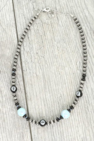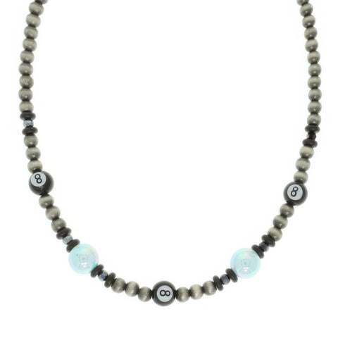 Product Description: Channel bold Western style with this beaded necklace featuring iconic 8-ball charms. Glossy beads and asher stone accents add vintage appeal to this edgy, retro-inspired accessory. Whether worn solo or stacked with other chains, this necklace brings a statement to casual and streetwear looks. Ideal for gamers, trendsetters, and fans of nostalgic fashion.