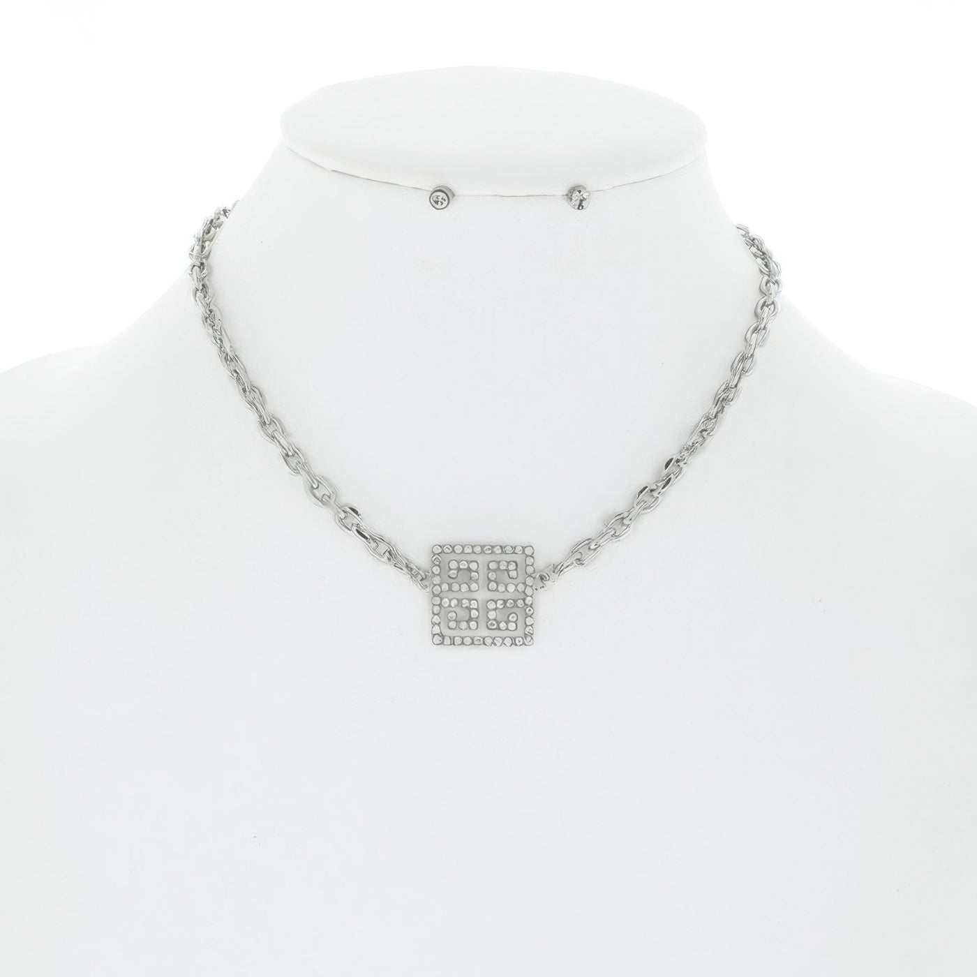 Product Description: Add bold glamour to your look with the Greek Key Square Crystal Pavé Necklace Set. Featuring a crystal pavé Greek key chain necklace paired with matching stud earrings, this set is a statement piece for both casual and elevated outfits. Its versatile gold and silver-tone design allows for styling with a variety of looks, while the sparkling detail makes it stand out. Perfect for parties, celebrations, or gifting, this set brings modern elegance with a touch of urban flair.