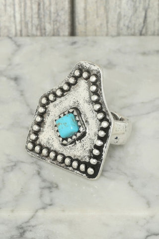 Product Description: Rugged yet refined, the Western Rigidized Cattle Tag Stretch Ring blends rustic charm with stylish flair. Crafted in oxidized silver-tone metal and accented with turquoise details, this cattle tag-shaped ring delivers a signature Western look. Its stretch fit ensures comfort for everyday wear, while the vintage-inspired design adds authenticity and character. Whether styled for a ranch tour, a weekend festival, or a casual outing, this ring makes a confident statement. It's a unique accessory that speaks to your roots and your sense of style.