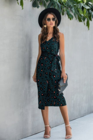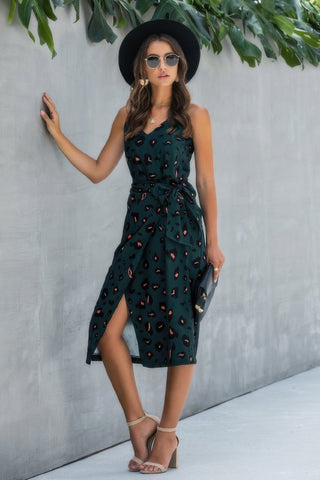 Sleeveless Print Split Thigh Belted Cami Dress - Green / S