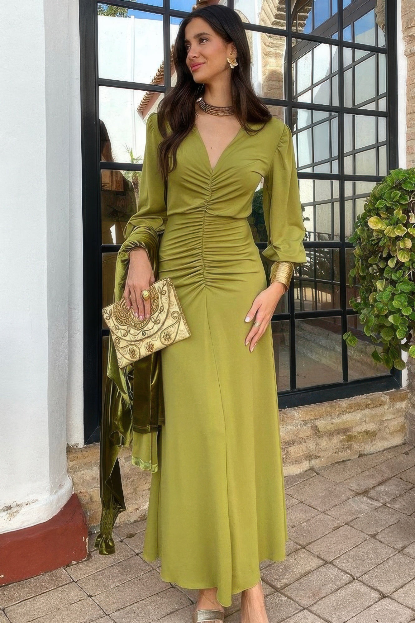 Product Description: Step into effortless elegance with this solid ruched V-neck dress, designed to flatter your figure and elevate your everyday style. Made from a comfortable blend of 95% polyester and 5% elastane, this dress offers a soft, stretchy fit that moves with you. The ruched detailing at the front complements the V-neckline, adding texture and visual interest, while the tight waist fit accentuates your silhouette beautifully. Ideal for everything from casual outings to vacation getaways, this versatile dress transitions seamlessly from day to night. Whether paired with sandals or heels, it’s a stylish choice for any occasion.